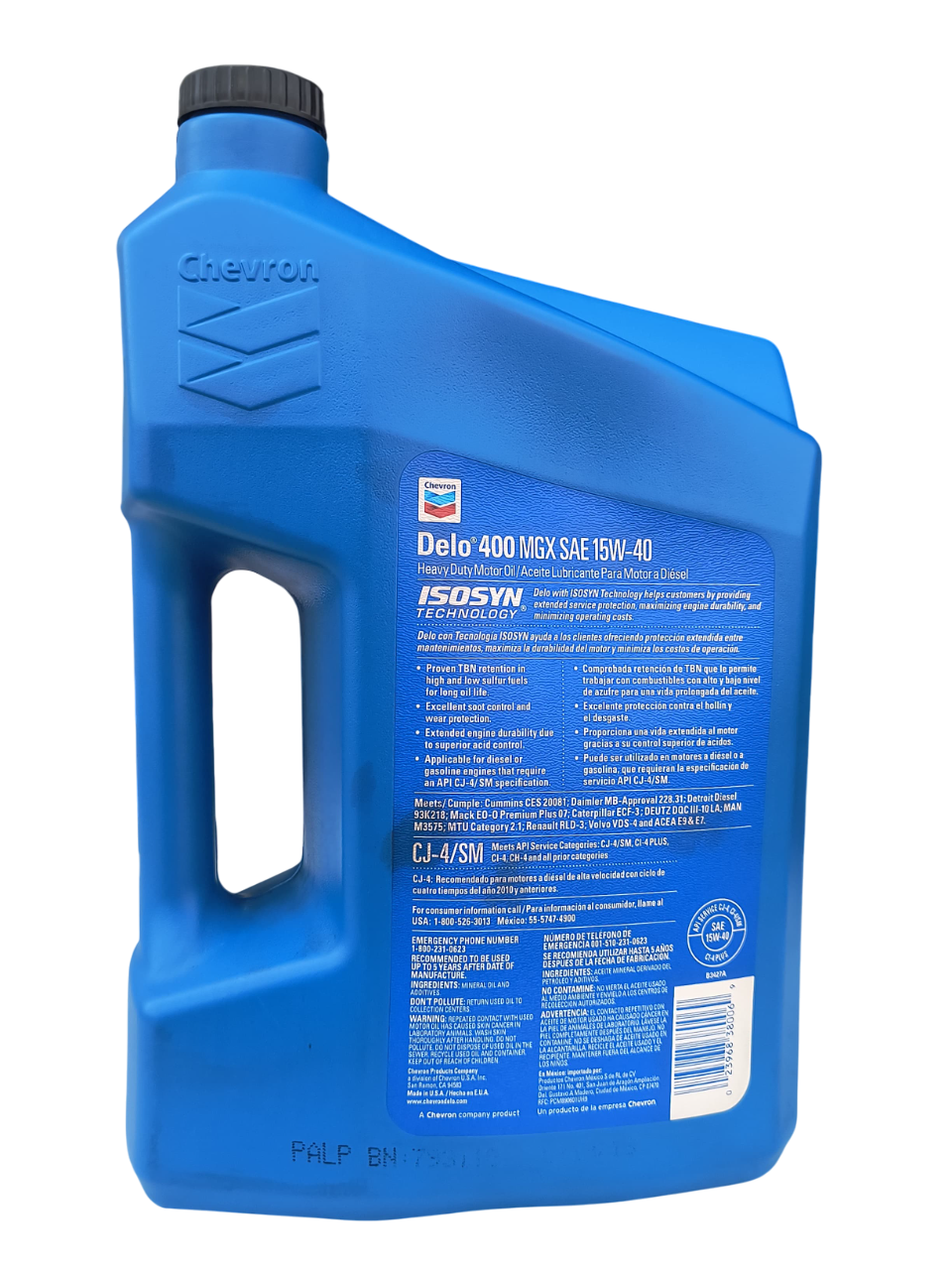 Chevron Delo 400 MGX SAE 15W-40 es un aceite de tecnología avanzada formulado con ISOSYN® Technology, que proporciona una protección excepcional contra el desgaste, la oxidación y la acumulación de hollín. Compatible con motores diésel equipados con o sin sistemas de control de emisiones, ofrece máxima durabilidad y rendimiento en flotas de transporte, maquinaria y equipos pesados. Cumple con API CK-4 y ACEA E9.