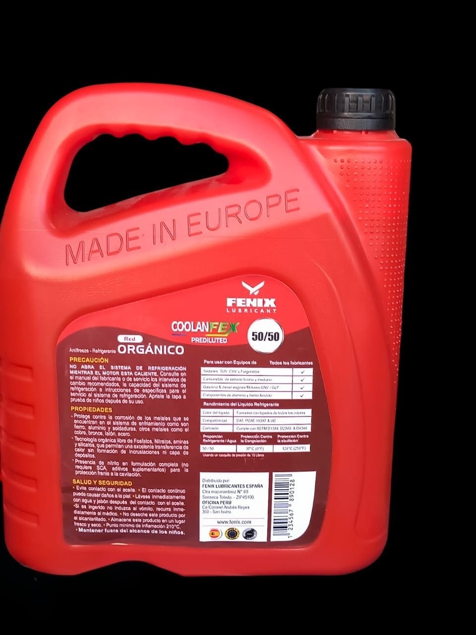 Fenix Coolant 50% Rojo es un refrigerante y anticongelante de alta concentración, diseñado para ofrecer protección completa al sistema de enfriamiento del motor. Su fórmula a base de etilenglicol y aditivos inhibidores de corrosión garantiza un excelente rendimiento tanto en climas fríos como cálidos, previniendo la congelación, ebullición, oxidación y formación de sarro