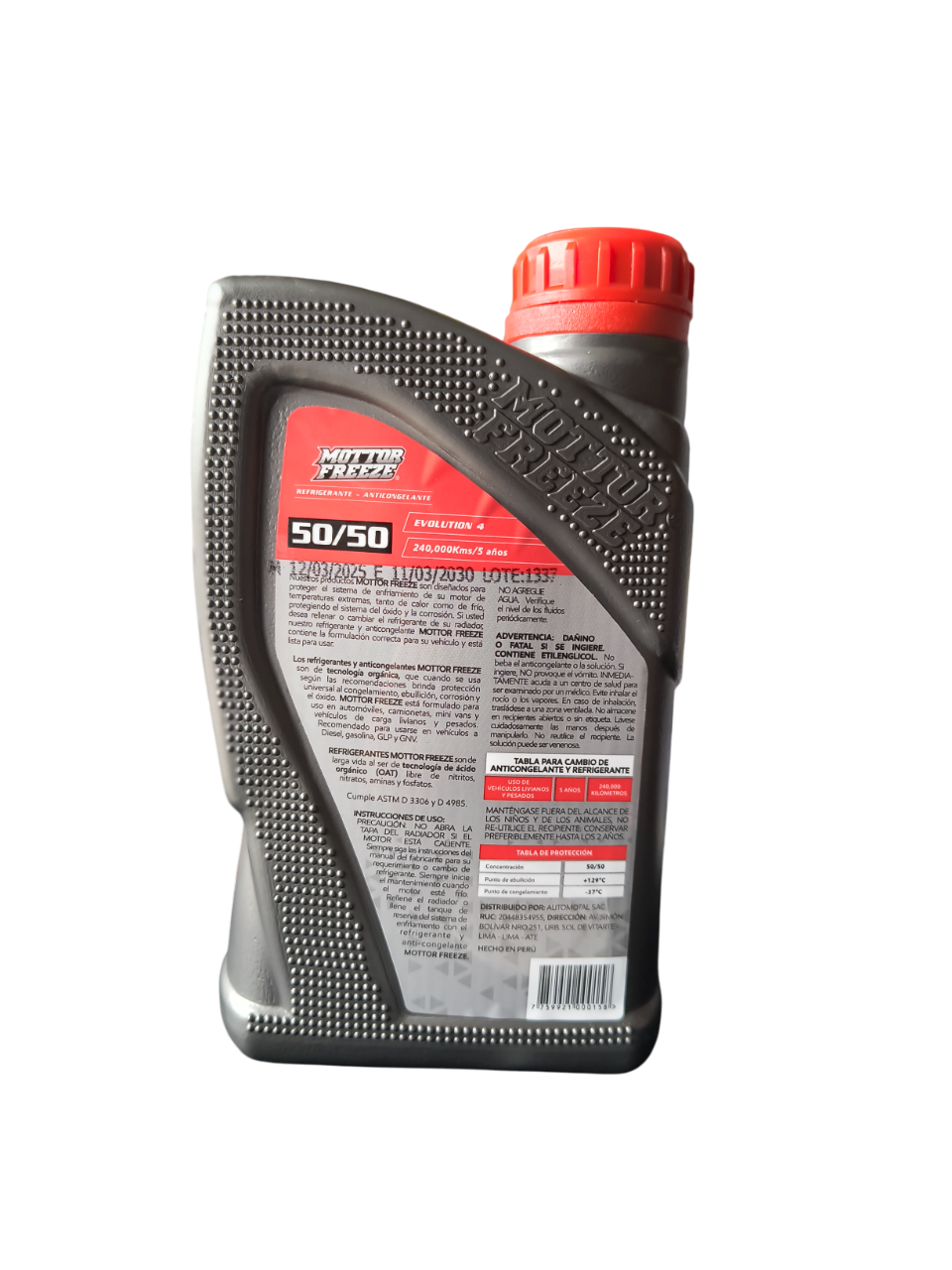 Motor Freeze 50% Rojo protege eficazmente el sistema de enfriamiento contra la corrosión, cavitación y altas temperaturas. Su fórmula orgánica de larga vida (OAT) ofrece una mezcla lista para usar al 50/50, ideal para motores modernos a gasolina y diésel que requieren alto rendimiento térmico.