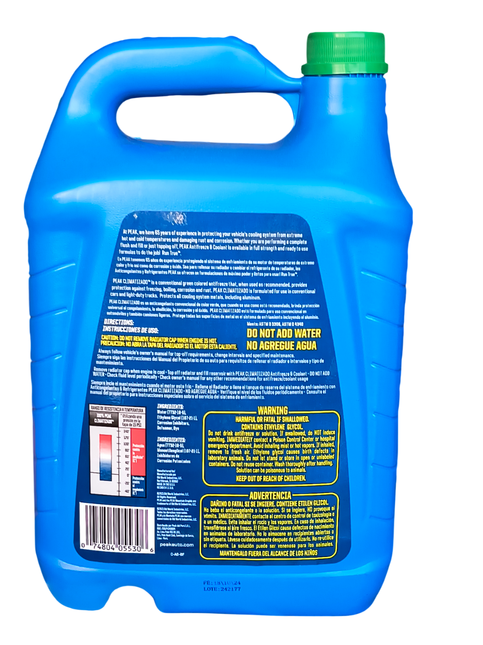 Peak Climatizado es un refrigerante premezclado diseñado para mantener la temperatura ideal del motor en todo tipo de clima. Su fórmula con inhibidores de corrosión protege radiadores, bombas de agua y metales del sistema de enfriamiento, asegurando un rendimiento estable y prolongado.
