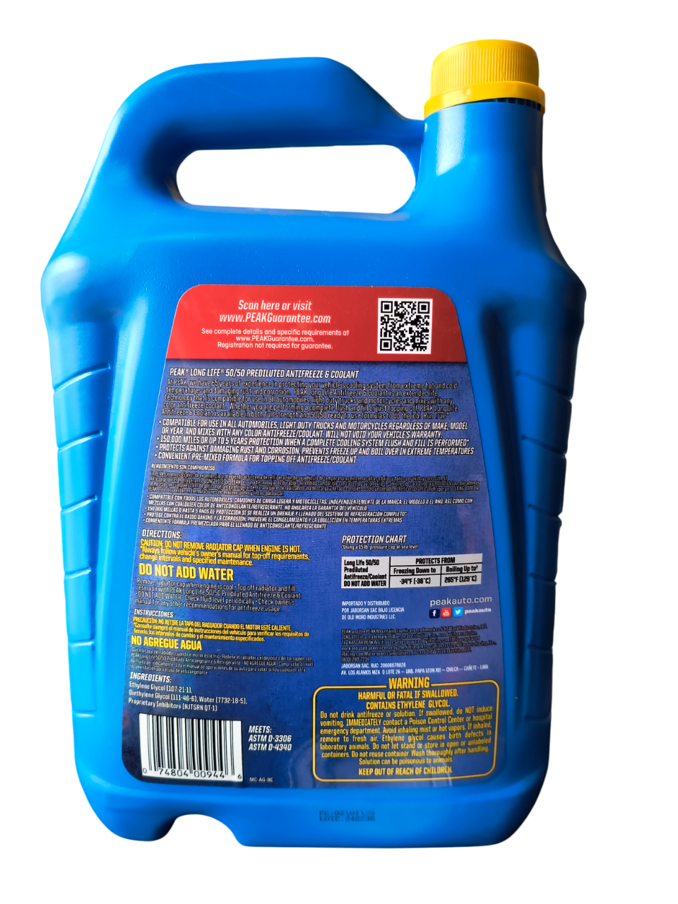 Peak Long Life 50% ofrece protección extendida contra la corrosión, el sobrecalentamiento y la cavitación. Su tecnología orgánica (OAT) sin silicatos garantiza una vida útil prolongada y compatibilidad con todos los metales del sistema de enfriamiento, ideal para vehículos modernos a gasolina y diésel.