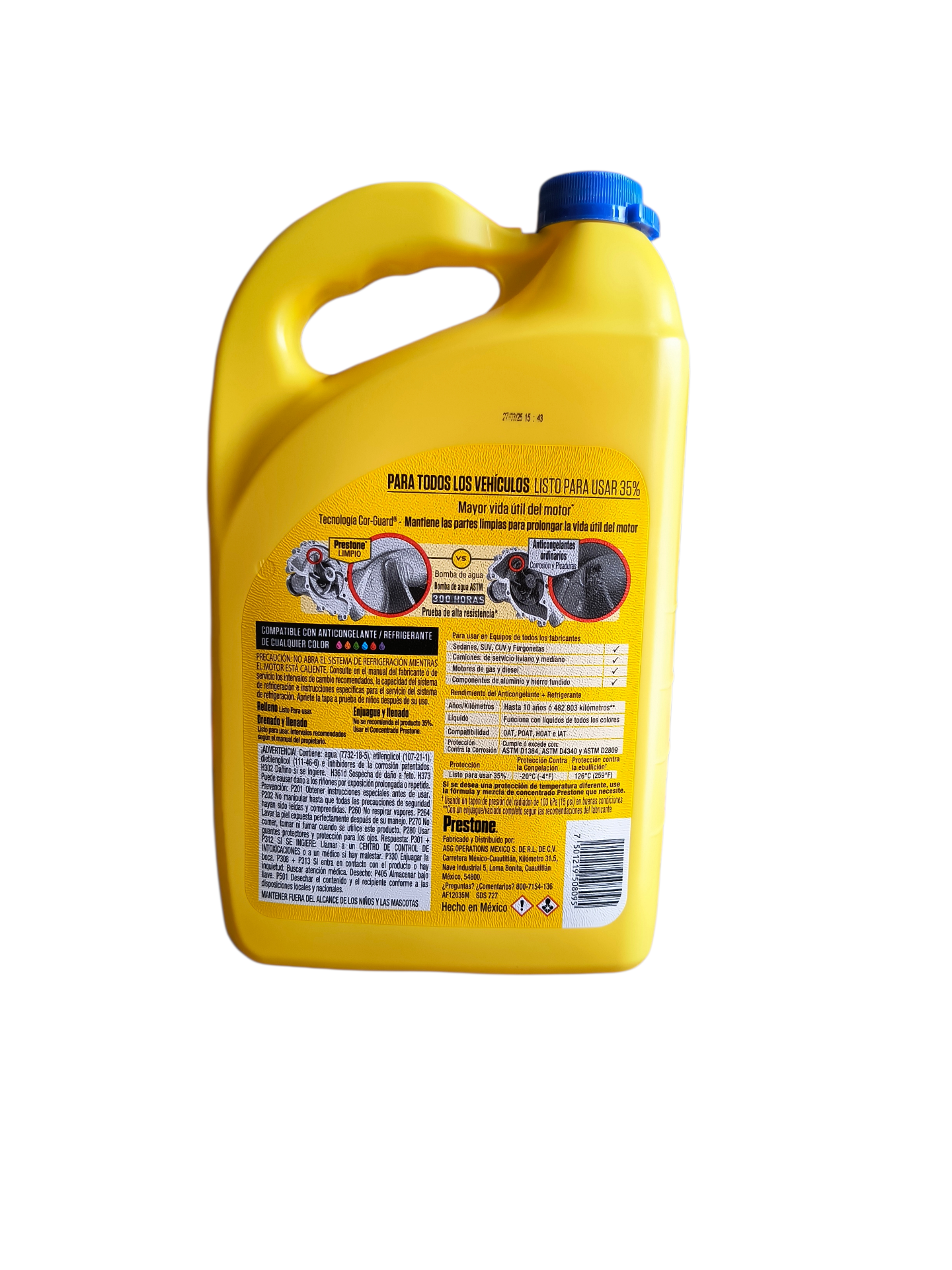 Prestone Coolant All Vehicles 35% en galón 4 litros es un refrigerante listo para usar formulado con tecnología Cor‑Guard® que protege el sistema de enfriamiento contra corrosión, oxidación y sobrecalentamiento. Está diseñado para proporcionar protección térmica desde aproximadamente –20 °C hasta +126 °C, lo que ayuda a prevenir el congelamiento en climas fríos y la ebullición en condiciones cálidas. Su fórmula es compatible con todos los colores y tipos de refrigerante, por lo que puede utilizarse en una amplia variedad de vehículos sin necesidad de mezclar con agua, y ayuda a prevenir sarro, óxido y depósitos en radiadores, bombas de agua y otros componentes del sistema de enfriamiento.