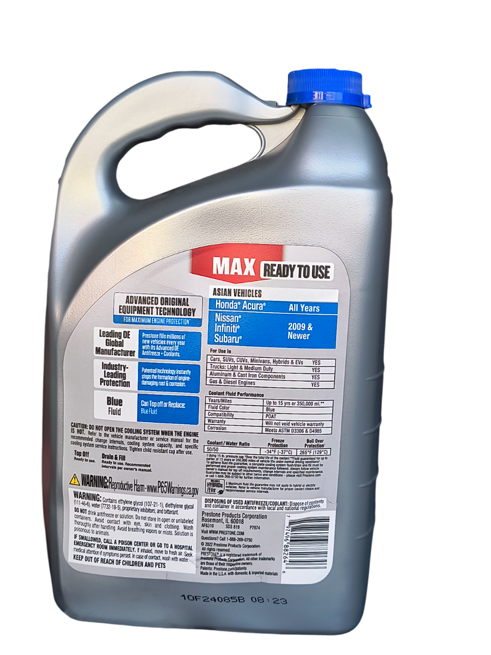 Prestone Max 50% Azul ofrece una protección superior contra la corrosión, el sobrecalentamiento y la congelación en sistemas de enfriamiento modernos. Su fórmula premezclada lista para usar garantiza un rendimiento confiable en vehículos de todas las marcas, tanto gasolina como diésel.