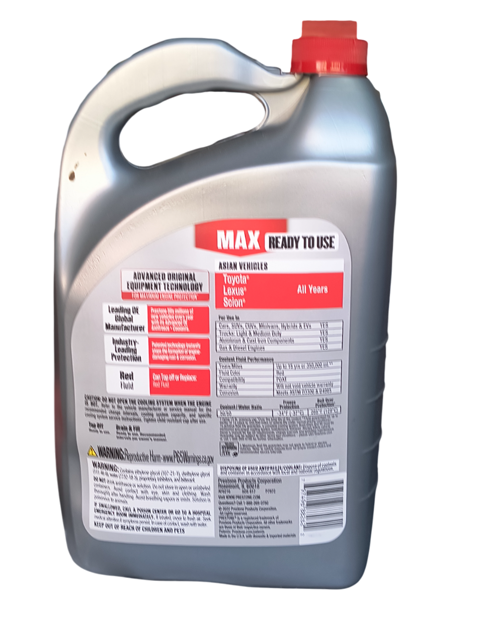 Prestone Max 50% Rojo protege eficazmente el sistema de enfriamiento frente a la corrosión, el sobrecalentamiento y la congelación. Su fórmula premezclada lista para usar asegura un rendimiento óptimo en vehículos modernos, compatible con motores gasolina y diésel.