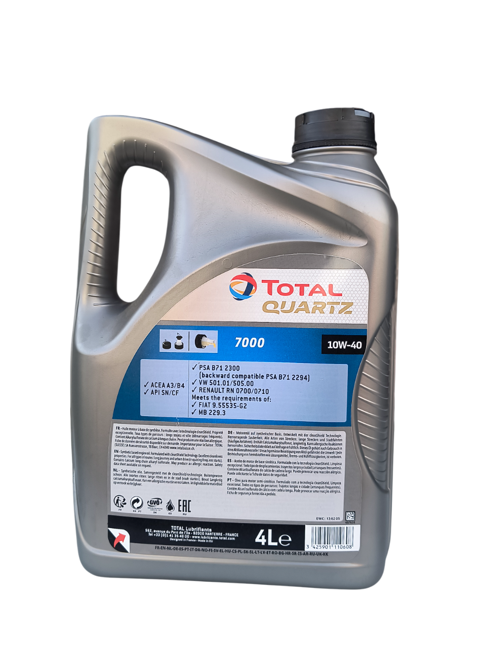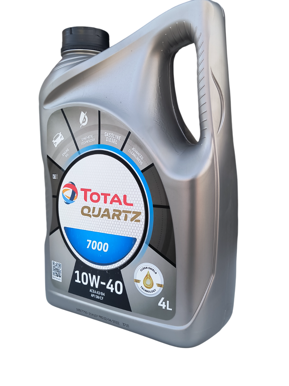 El Total Quartz 7000 10W-40 es un aceite semisintético de alto rendimiento desarrollado para motores gasolina y diésel, incluyendo aquellos con turbocompresor o inyección directa. Su avanzada formulación ofrece excelente protección contra el desgaste, limpieza superior del motor y alta estabilidad térmica, garantizando mayor durabilidad y eficiencia energética. Facilita los arranques en frío y mantiene un rendimiento óptimo en condiciones exigentes. Cumple con las especificaciones API SL/CF y ACEA A3/B4.