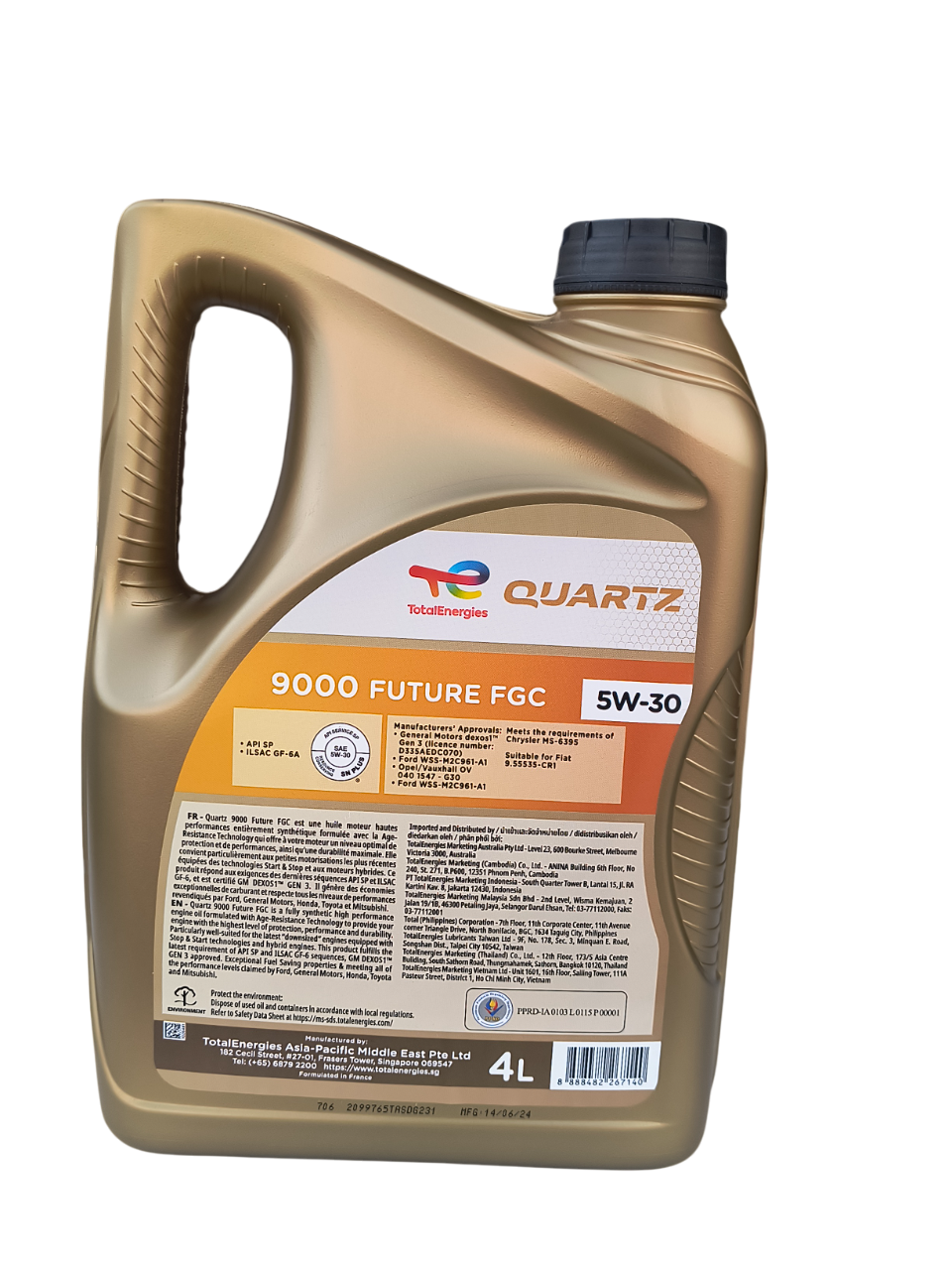 El Total Quartz 9000 Future 5W-30 es un aceite 100% sintético de alta tecnología, diseñado para motores modernos gasolina y diésel, incluyendo turbocompresores e inyección directa. Ofrece excelente protección contra el desgaste, limpieza superior del motor y alta estabilidad térmica, asegurando mayor durabilidad y eficiencia de combustible. Cumple con las especificaciones API SN/CF y ACEA A3/B4, garantizando rendimiento óptimo en condiciones exigentes de operación.