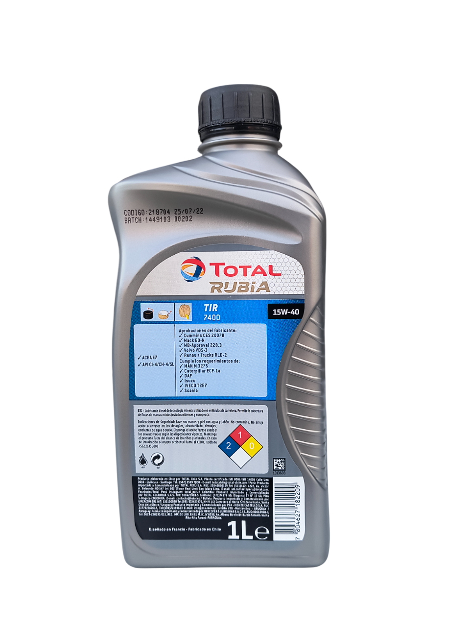 El Total Rubia TIR 7400 15W-40 es un lubricante mineral de alto rendimiento diseñado para motores diésel de vehículos pesados y maquinaria de transporte. Ofrece excelente protección contra el desgaste, la oxidación y la acumulación de depósitos, manteniendo el motor limpio y eficiente incluso en condiciones severas de operación. Cumple con las especificaciones API CI-4/CH-4 y ACEA E7, garantizando mayor durabilidad del motor y menores costos de mantenimiento.