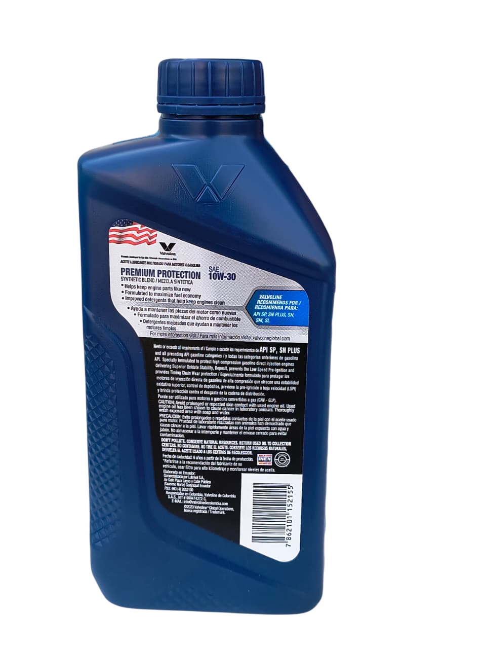El Valvoline 10W-30 Semi Sintético es un lubricante de alto rendimiento con base semisintética, formulado para motores gasolina y diésel modernos. Proporciona protección eficaz contra el desgaste, oxidación y formación de depósitos, asegurando arranques en frío confiables, buen rendimiento térmico y mayor durabilidad del motor. Cumple con las especificaciones API SN/CF y ACEA A3/B4, ofreciendo un equilibrio entre rendimiento y economía.