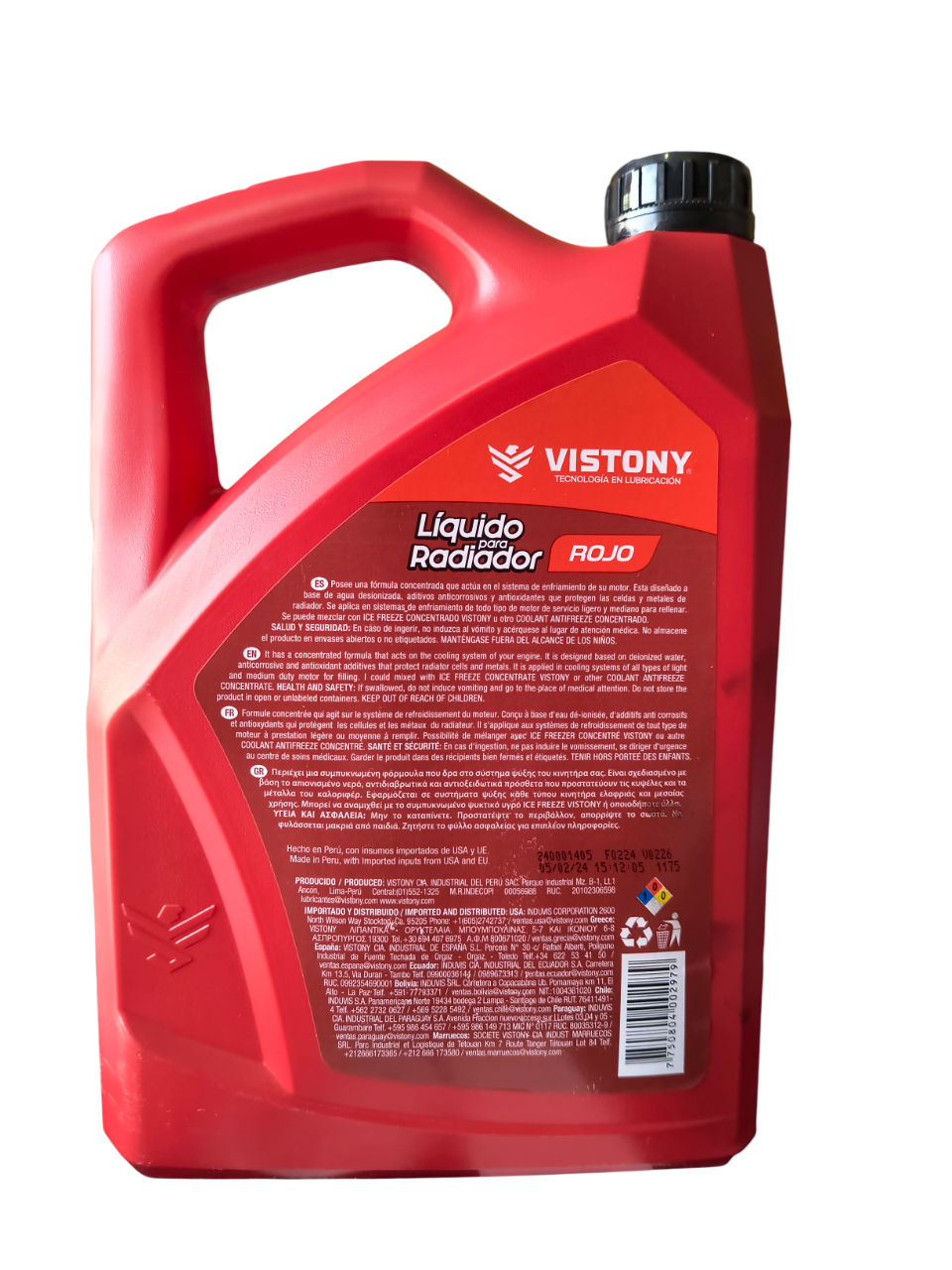 Vistony Coolant Rojo es un refrigerante de alto rendimiento que protege el motor contra sobrecalentamiento, corrosión y formación de depósitos. Ideal para todo tipo de vehículos, garantiza una temperatura óptima de operación y prolonga la vida útil del sistema de enfriamiento.