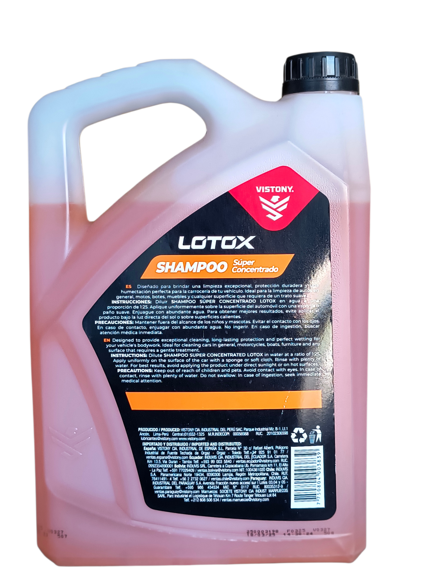 Vistony Lotox Shampoo es un producto hecho a base de aceites acondicionados y tensoactivos de gran capacidad detergente que otorgarán la limpieza y humectación perfecta a la carrocería de su automóvil. Este producto tiene la consistencia exacta para otorgar una alta lubricidad sobre la superficie de su auto, haciendo que la suciedad y el polvo resbalen, dándoles claridad a los acabados.